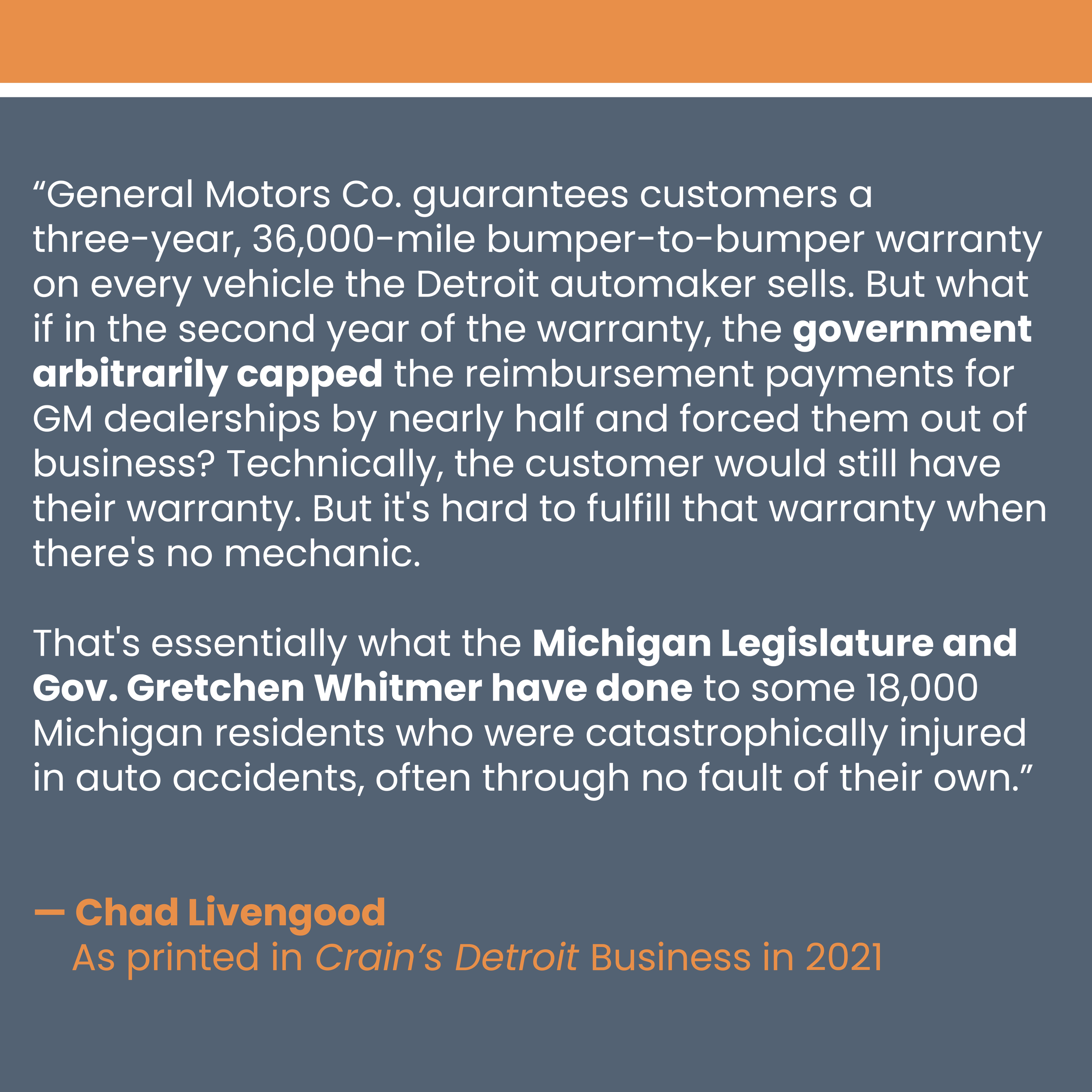 This cut has led to Michigan’s ongoing crisis in care, which has directly caused the deaths of several catastrophically injured Michigan residents—who were living happy and productive lives prior to the implementation of the cut—as well as the discharge of more than 7,000 patients, the loss of more than 4,000 health care jobs, and closure of dozens of businesses.